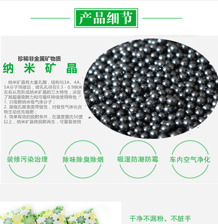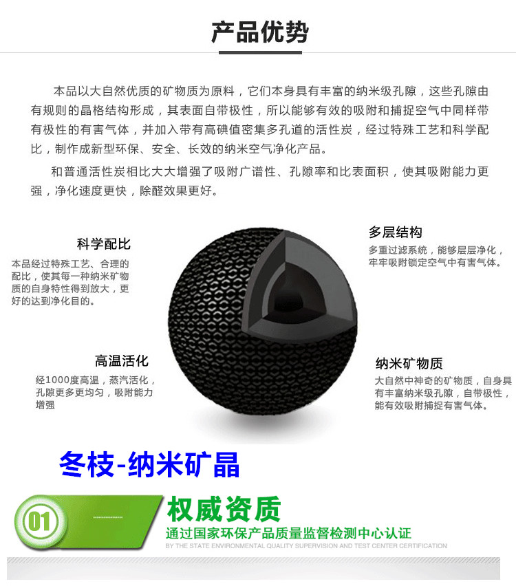 冬枝纳米矿晶是以海泡石、凹凸棒土、硅藻土(硅藻泥)都是自然界赐给我们的珍稀非金属矿物质,是富孔矿物吸附剂,这些矿物质经过合理的配置,形成纳米矿晶空气净化剂产品。其中海泡土和凹凸棒的纳米晶格可以吸附空气中的开云网投(中国)有限公司、苯、氨等有毒有害的纳米级小分子极性物质,而硅藻土除了可以吸附微米级的大分子空气杂质、还为纳米矿晶提供吸附通道,提高纳米矿晶的吸附效果。纳米矿晶空气净化剂有吸附速度快,针对极性分子,可以循环使用的特点。